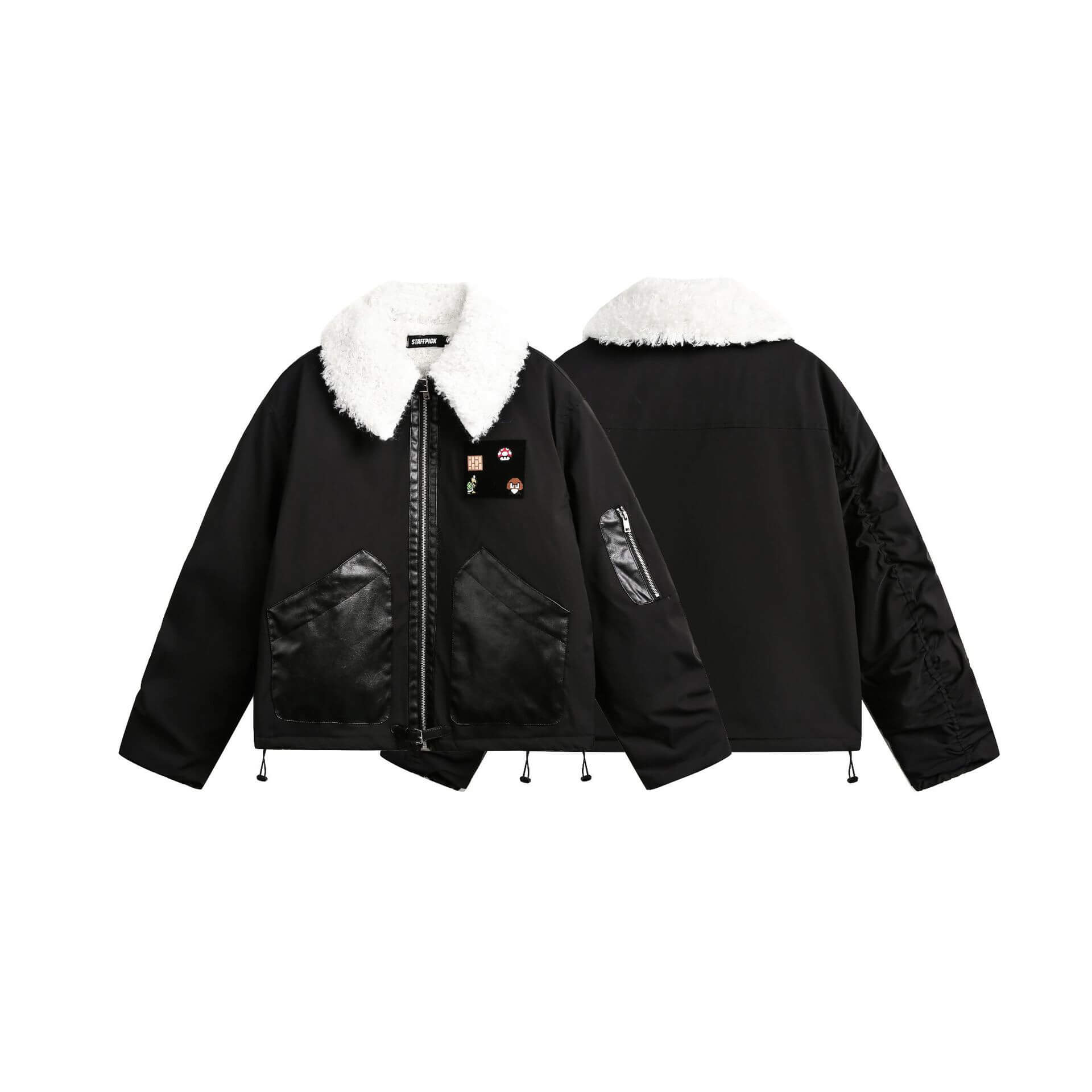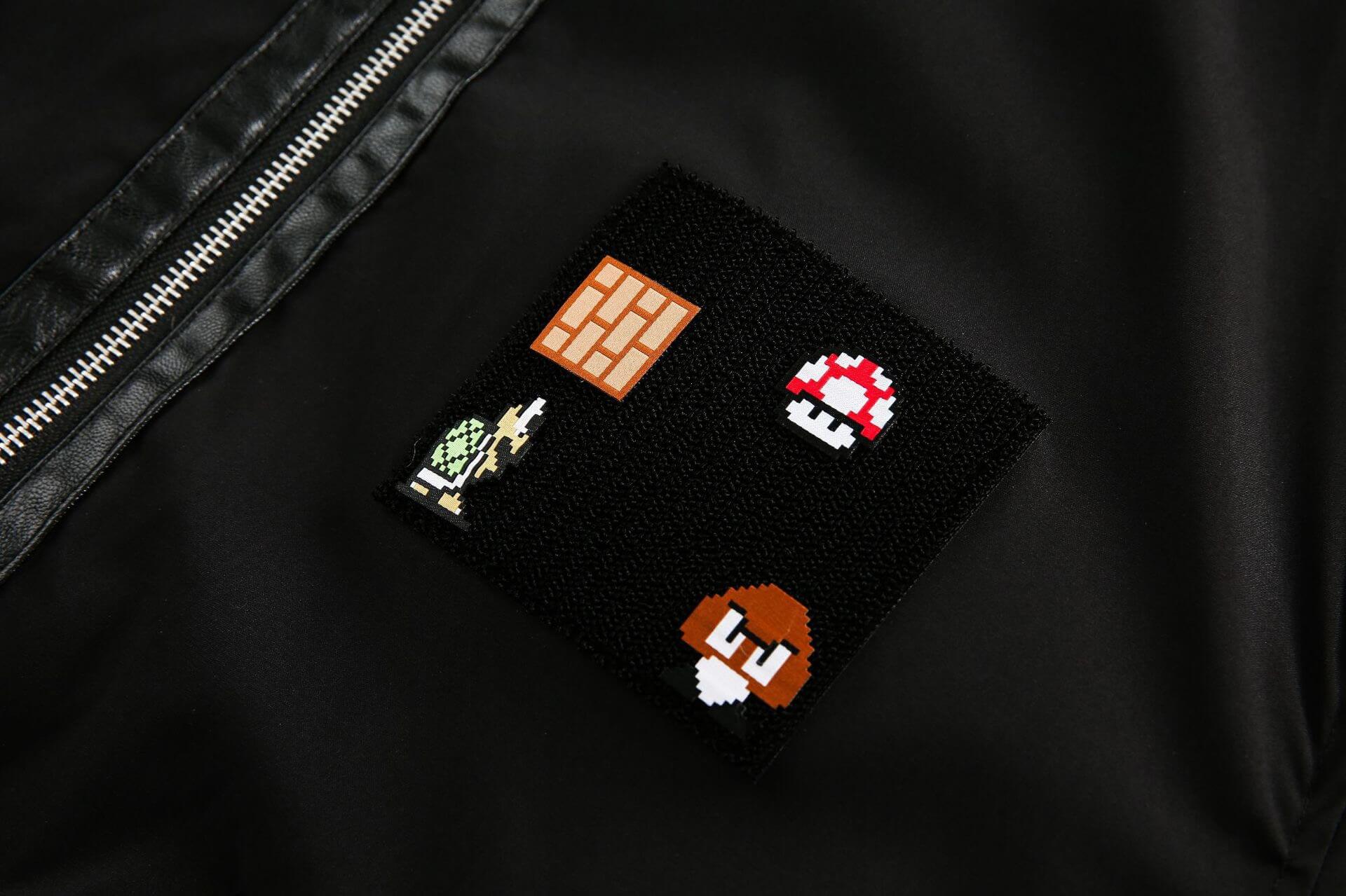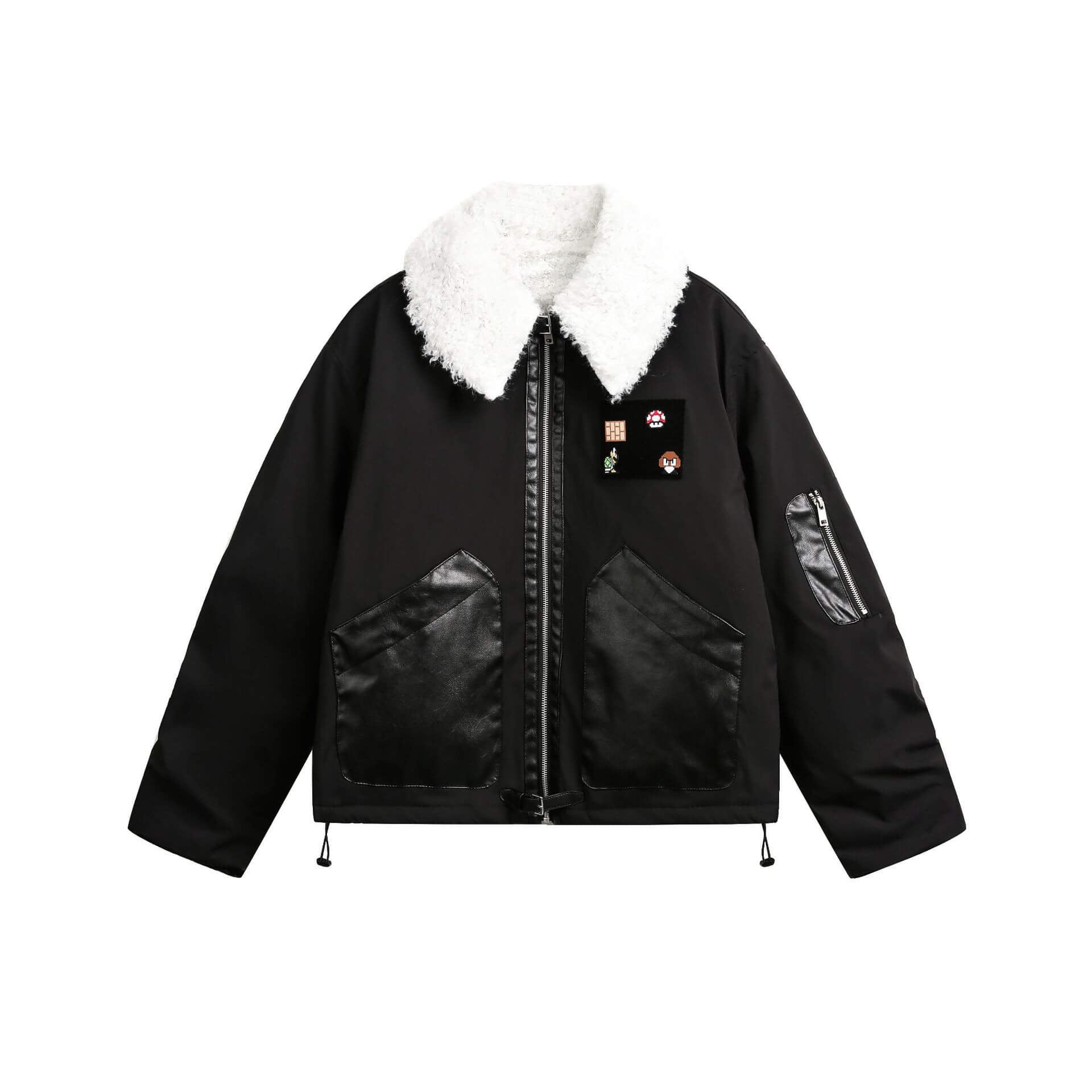 - Unique Design: Featuring a classic black exterior paired with a soft white sherpa collar, this jacket adds a touch of sophistication. The playful Mario-themed embroidered patches bring a retro and fun vibe to the overall look.